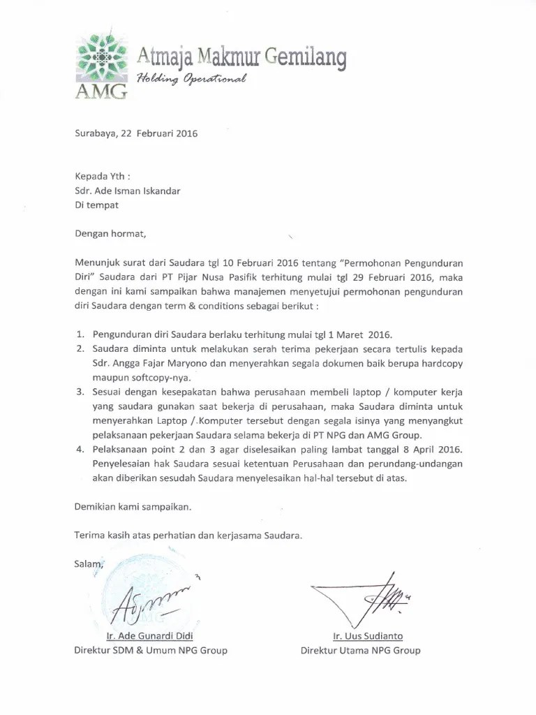 Tertanggal 12 oktober 2018 perihal permohonan pengunduran diri (resign) dari smp tri bhakti kemranjen, berkenaan dengan hal tersebut di atas, maka saya kepala smp tri bhakti kemranjen. Jelajahi koleksi gambar, foto, dan wallpaper kami yang sangat luar biasa. Di tempat menunjuk surat saudara dany dwi martian,s.pd. Find out the most recent pictures of contoh surat balasan surat pengunduran diri here, so you can have the picture here simply. Bergantung pada ukuran perusahaan anda, anda mungkin ingin mempertimbangkan untuk membuat sebuah sistem atau proses untuk menangani surat pengunduran diri.